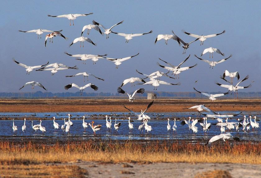 吉林中西部地区地域辽阔,湖、泡密布,湿地面积广阔。多年来,吉林省先后建立了多个湿地保护区,并实施了河湖连通、湿地引水等多项保护工程,有效保护了吉林中西部湿地野生动植物资源,珍稀濒危种群得到持续恢复与发展,白鹤、东方白鹳、天鹅、白头鹤等珍稀濒危湿地野生鸟类在吉林停歇觅食数量持续增长。去年进入10月份,吉林中西部各湿地保护区,陆续迎来大批候鸟,它们在广袤的湿地上,或飞翔,或觅食,或追逐……