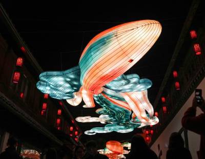 2月12日,游客在三门峡陕州地坑院龙年灯会上参观游园。