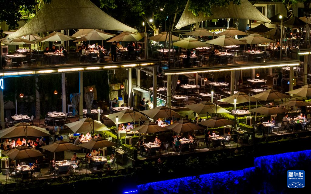 8月23日晚间,重庆南岸区南山风景区内一家网红火锅店,慕名而来的游客在品尝特色美食--重庆火锅(无人机照片)。