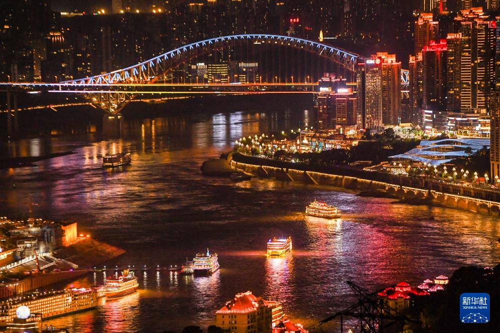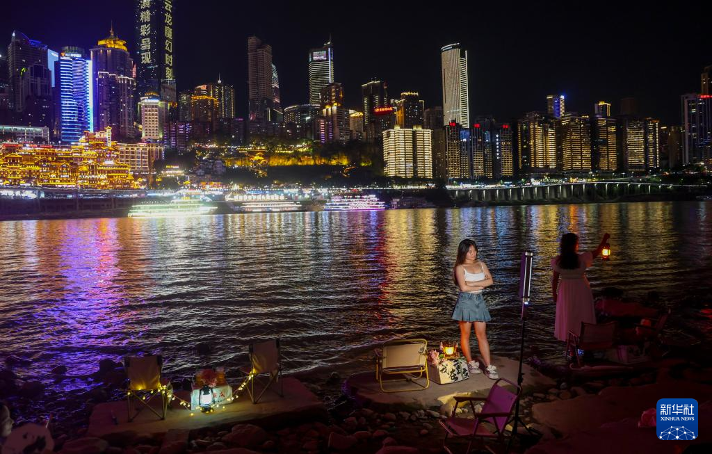 8月23日,重庆江北区嘉陵江畔,游客们在迷人的重庆夜景中打卡拍照。