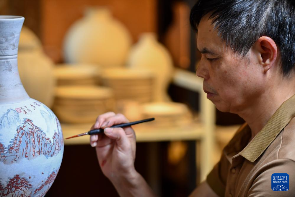 在长沙铜官老街,长沙窑铜官陶瓷烧制技艺非遗传承人刘志广在展示陶瓷彩绘(9月11日摄)。