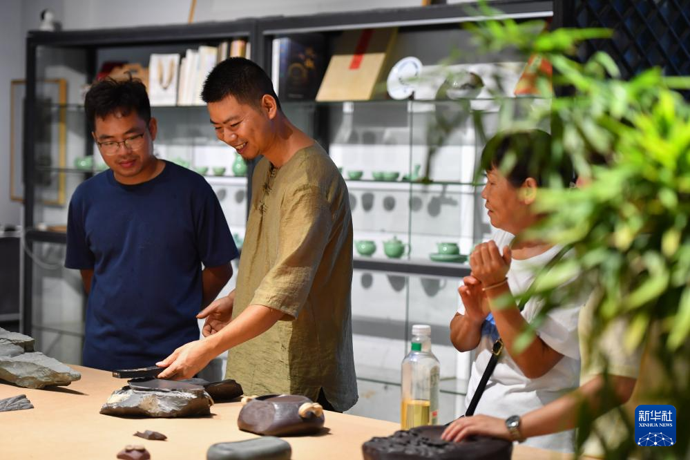 在长沙铜官窑国风乐园,谷山砚雕刻技艺非遗传承人张学军(中)向游客展示制作好的砚台(9月11日摄)。