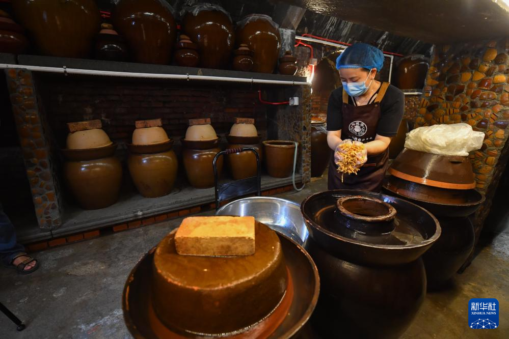 在长沙望城区铜官街道,陶蔬恋窖藏坛子菜非遗传承人李旭将制作完成的萝卜干从老坛里取出(9月11日摄)。