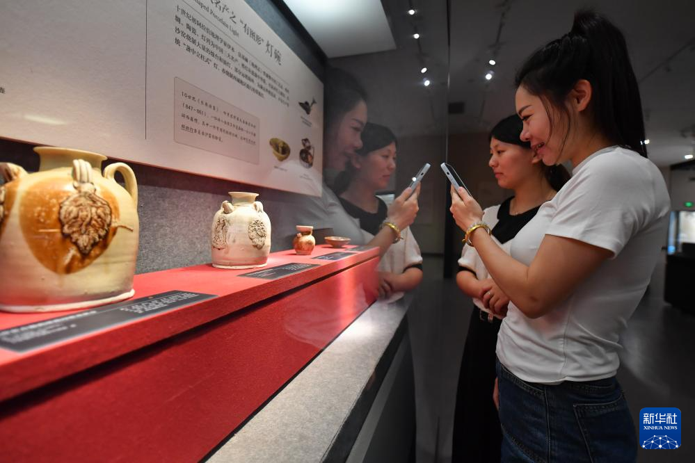 在长沙铜官窑博物馆,游客在拍摄“黑石号”沉船出水的长沙窑青釉褐绿彩阿拉伯文碗(9月11日摄)。