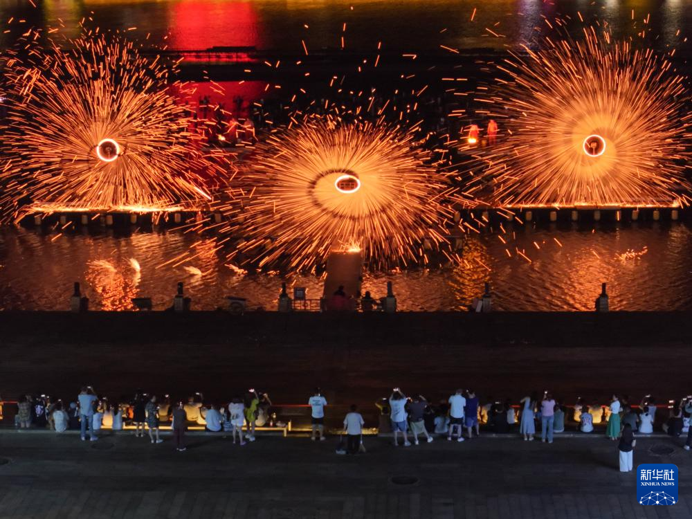 在长沙铜官窑国风乐园,游客在观看“打铁花”表演(9月11日无人机照片)。