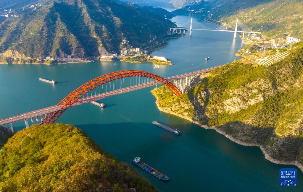 11月20日,船舶行驶在长江三峡西陵峡湖北省宜昌市秭归县水域(无人机照片)。