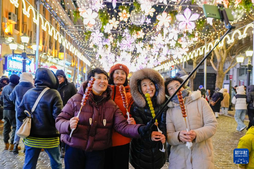1月30日,游客在哈尔滨中央大街上游玩、拍照。