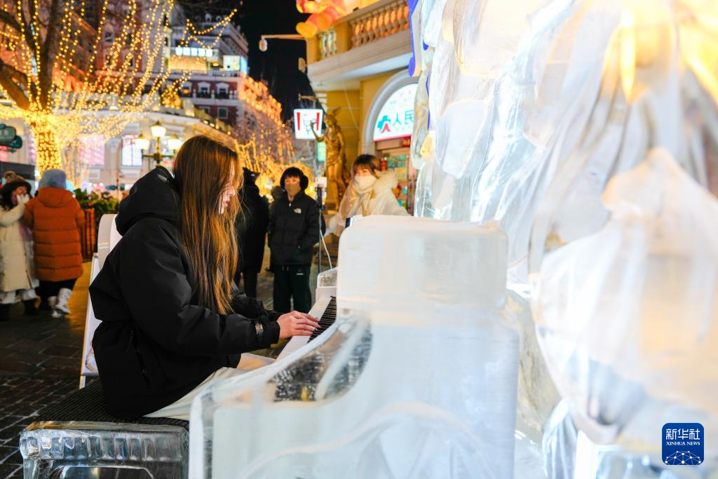 1月30日,游客在哈尔滨中央大街上弹奏冰钢琴。
