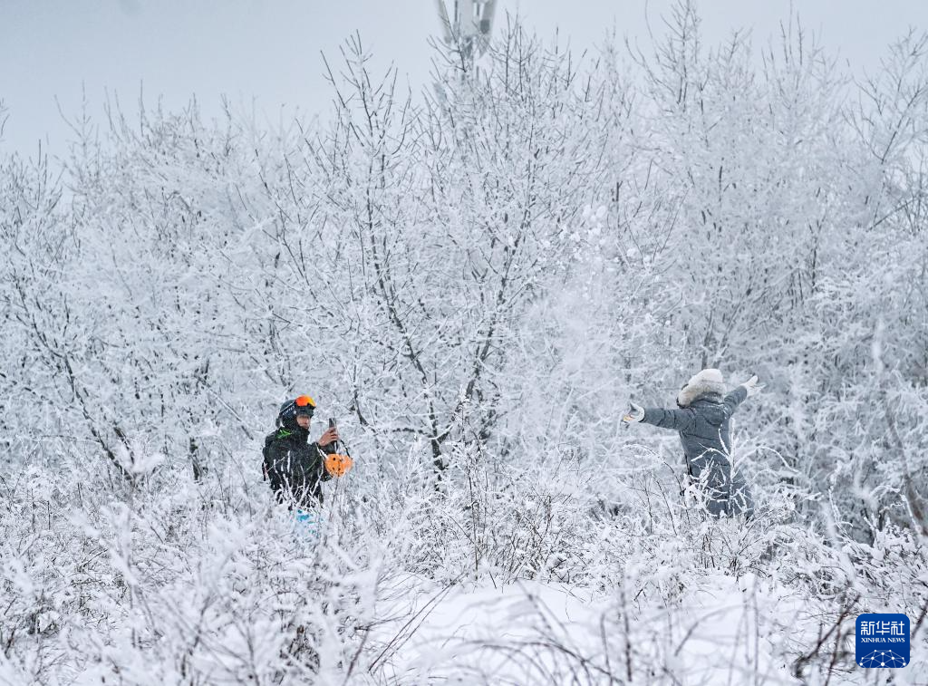 1月29日,游客在吉林市万科松花湖度假区山顶欣赏高山雾凇。