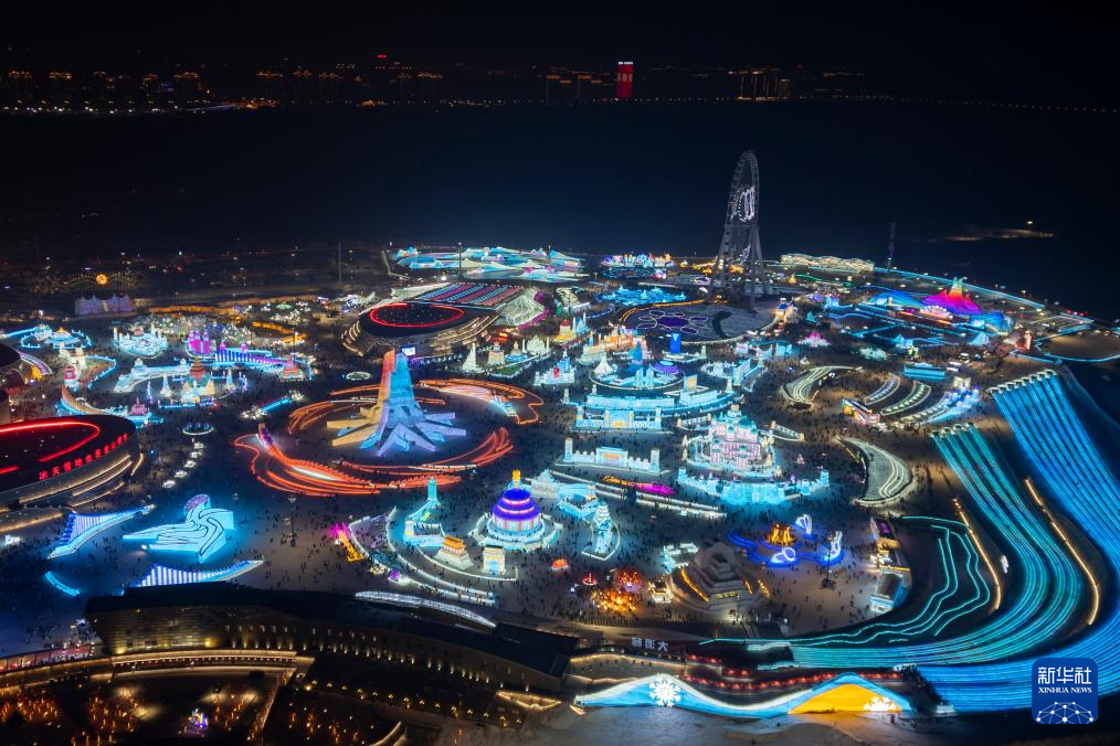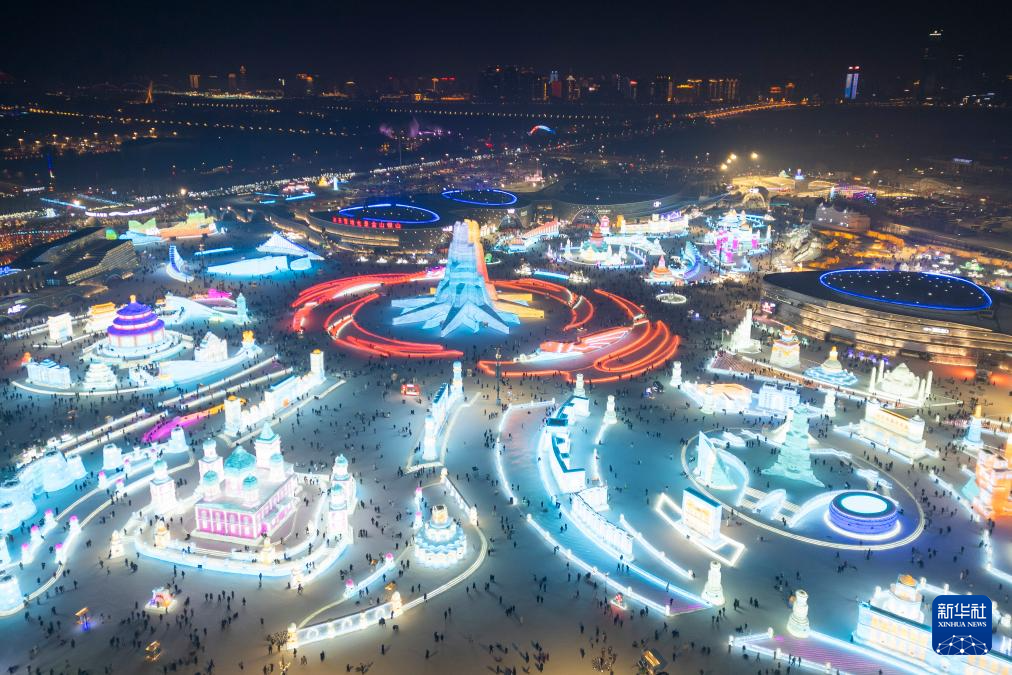1月31日,游客在哈尔滨冰雪大世界园区游玩(无人机照片)。