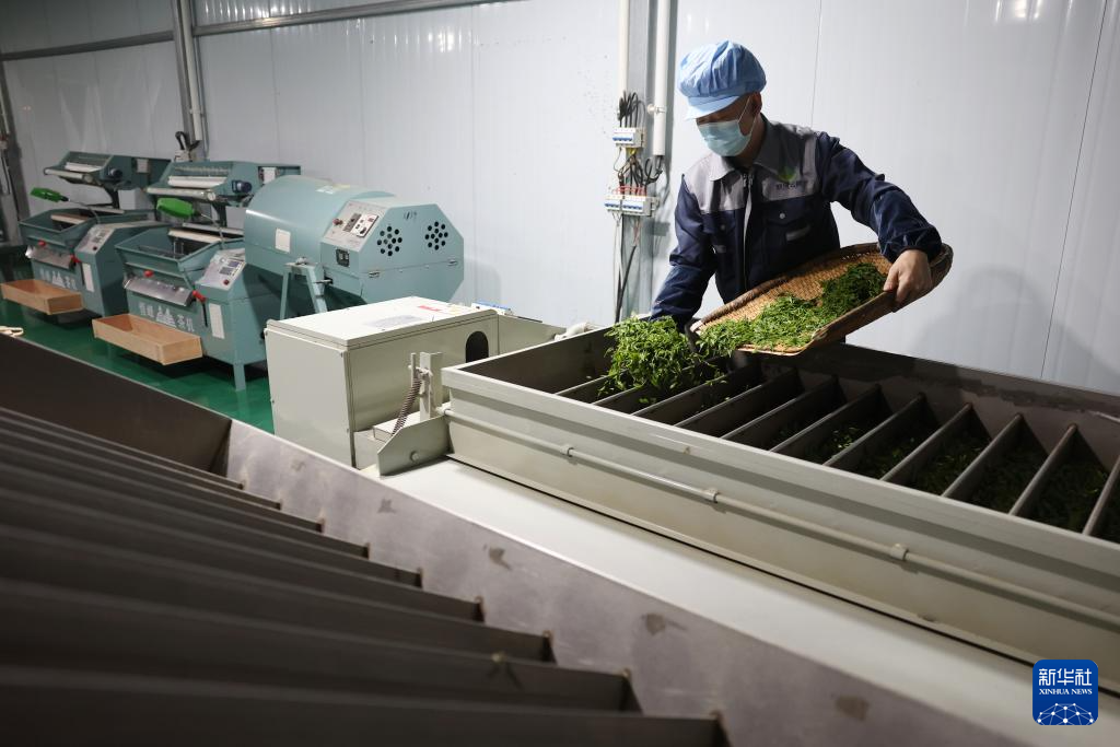 在陇南市康县铜钱镇双河村丰正源种植农民专业合作社,一名工作人员在摊晾茶叶鲜叶(4月20日摄)。
