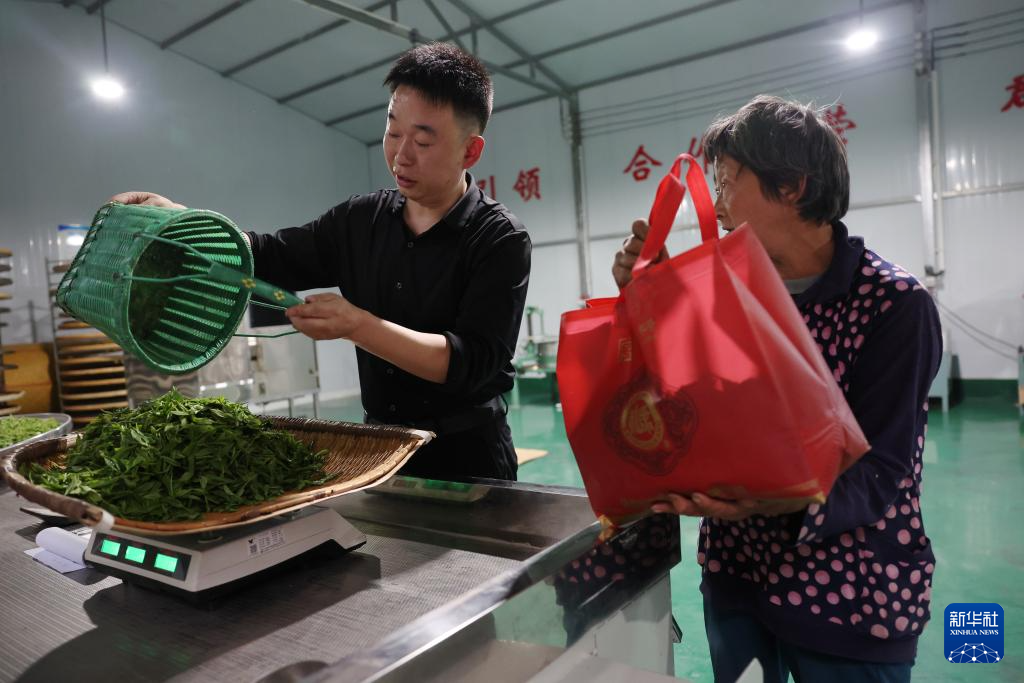 在陇南市康县铜钱镇双河村丰正源种植农民专业合作社,负责人王会明(左)和茶农一起给刚刚采摘的茶叶鲜叶过称(4月20日摄)。