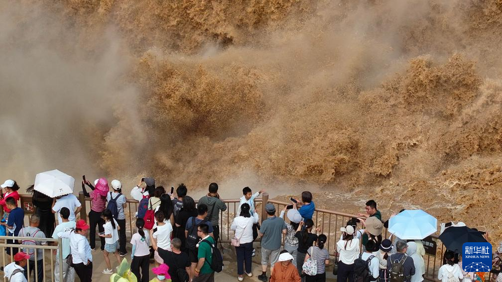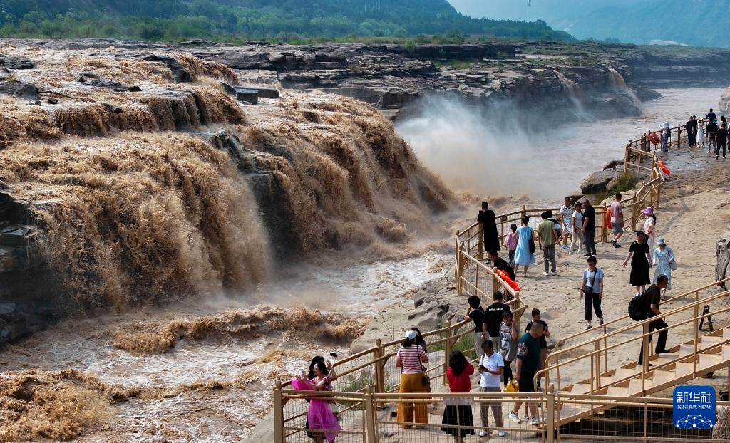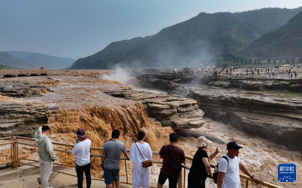 近日,位于陕西宜川县和山西吉县交界处的黄河壶口瀑布旅游区迎来大批游客。受上游降雨增多等因素影响,近期黄河壶口瀑布水量充沛,流量大幅提升,呈现金涛拍岸的景观。