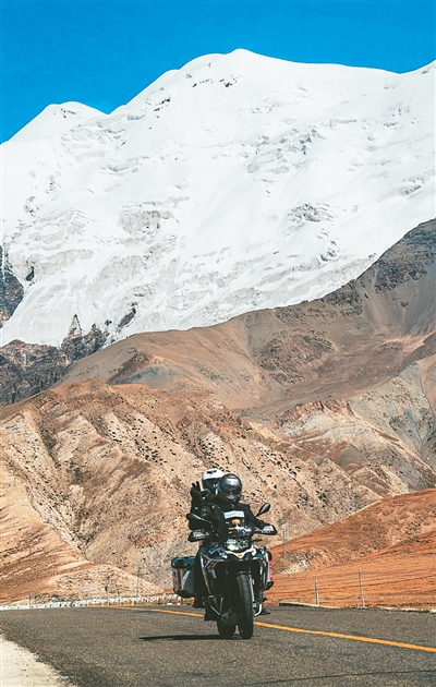 外国游客摩托车骑行在西藏山南。