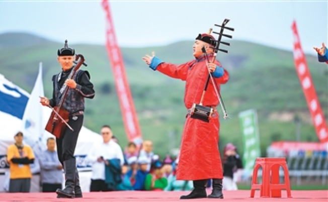 演员在内蒙古自治区第十一届少数民族传统体育运动会(巴林右旗分赛场)开赛仪式上表演。