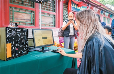 外国留学生在西山八大处红色电波展室前体验用摩尔斯电码发报。