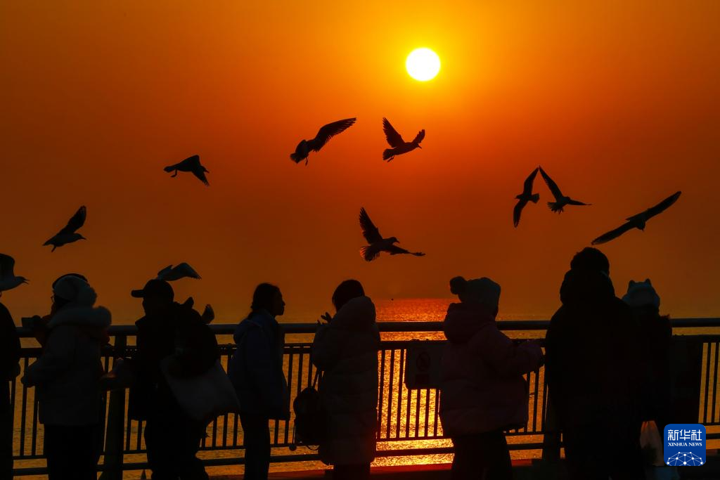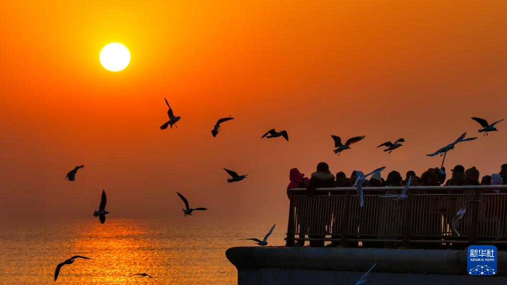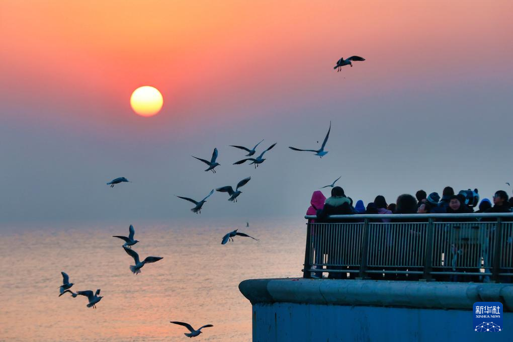 12月6日,游人在天津市滨海新区东疆亲海公园观赏海鸥和日出。