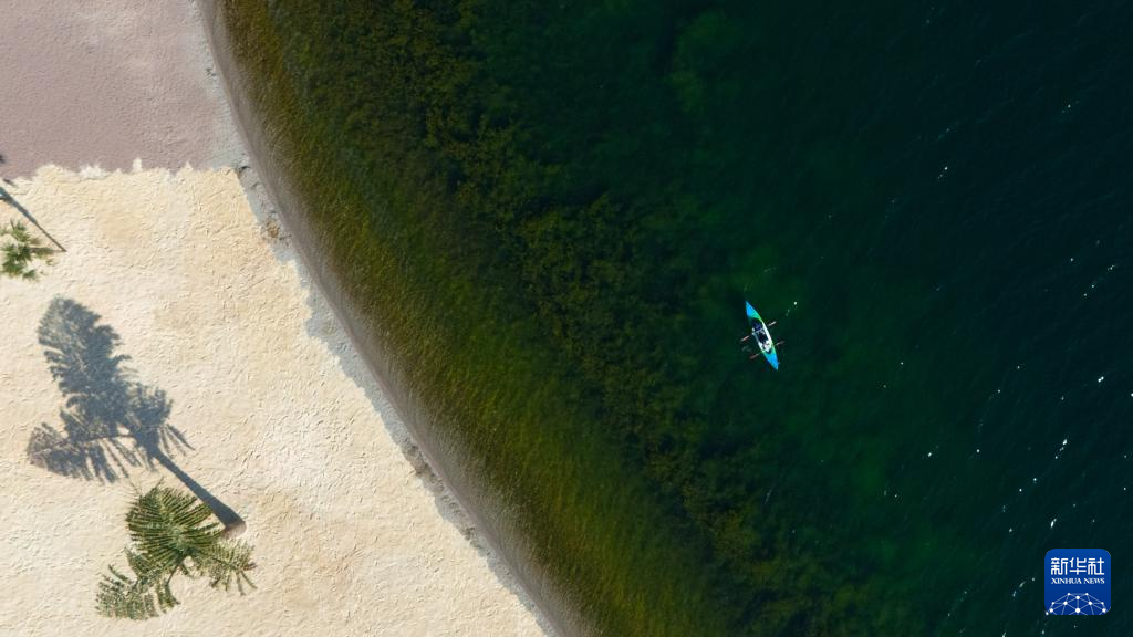 1月27日,游客在云南省玉溪市抚仙湖划船游玩(无人机照片)。