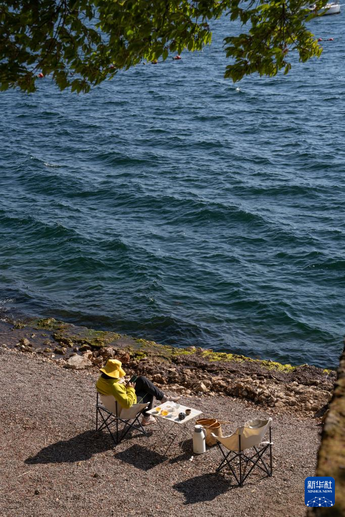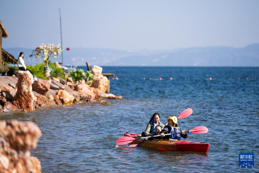 1月27日,游客在云南省玉溪市抚仙湖畔休闲。