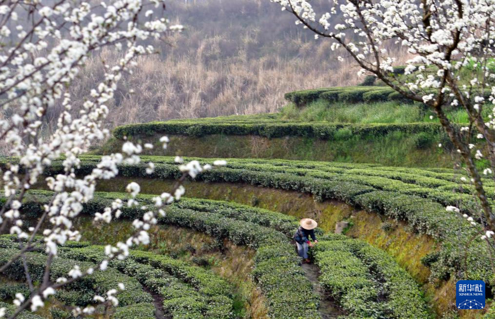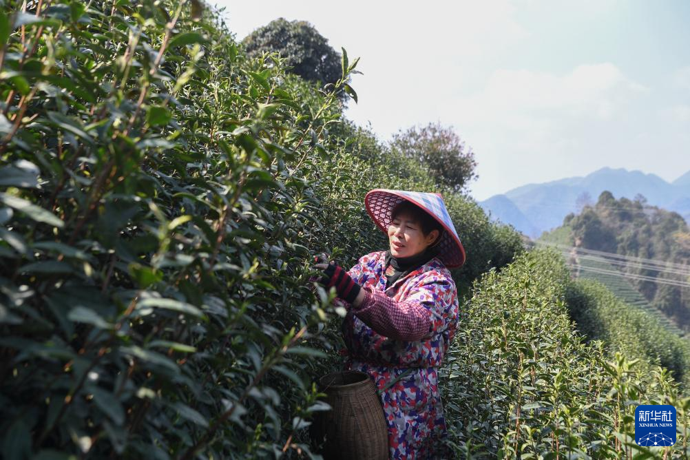 3月13日,茶农在三峡库区湖北省宜昌市秭归县茅坪镇金缸城村一茶园采摘春茶。