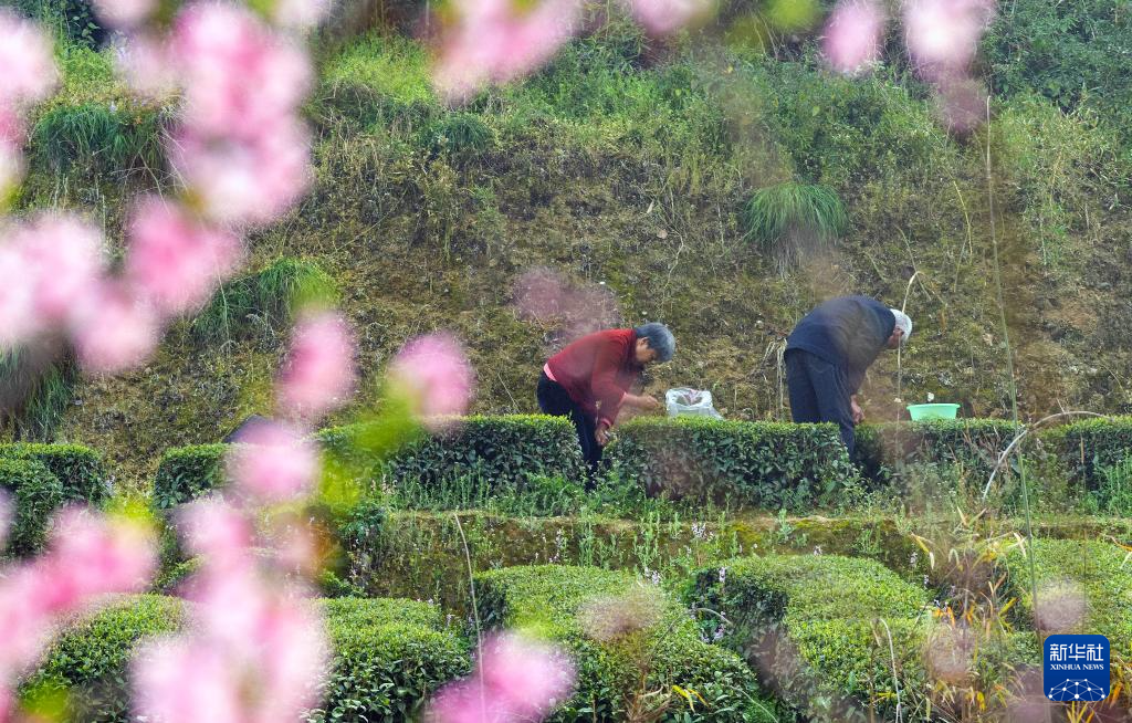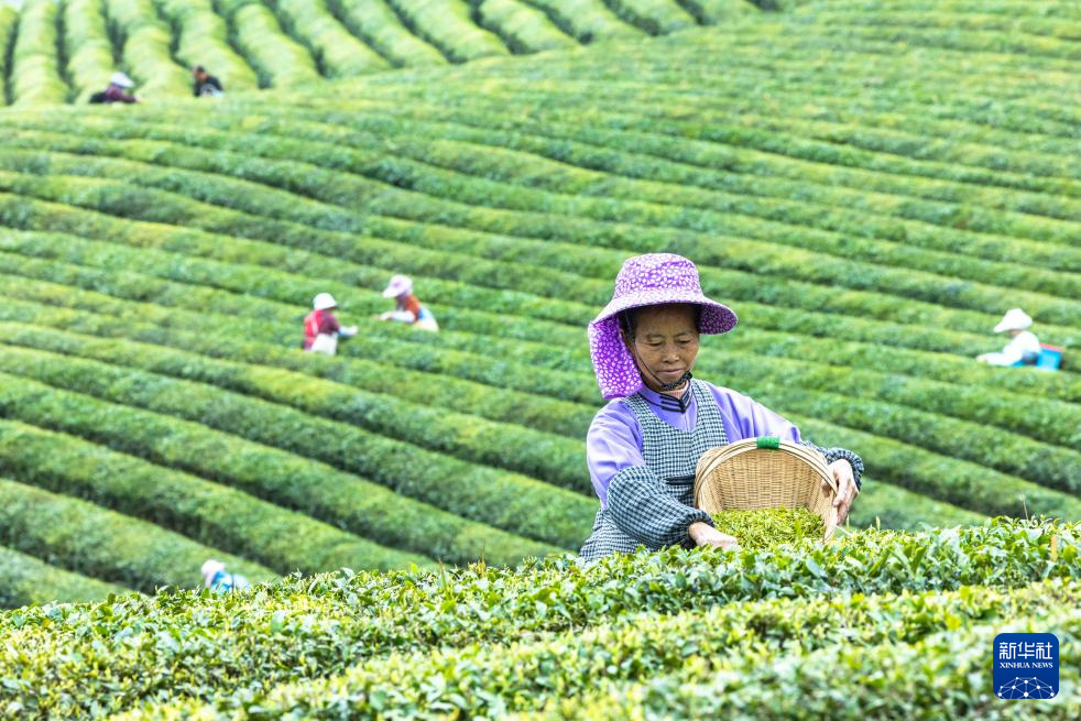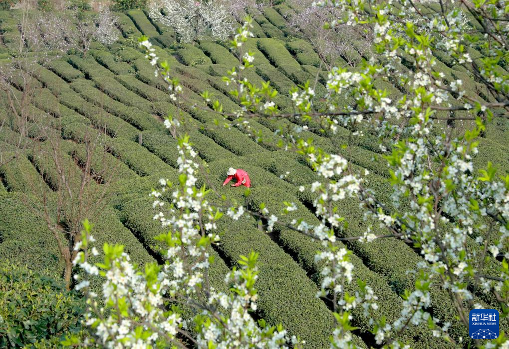 3月13日,茶农在贵州省安顺市西秀区双堡镇银山茶场采摘春茶。