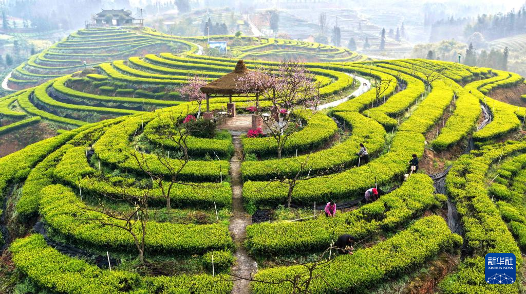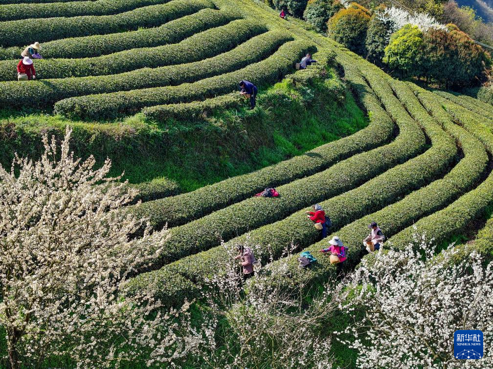 3月12日,茶农在贵州省开阳县南龙乡田坎村茶园采摘春茶(无人机照片)。
