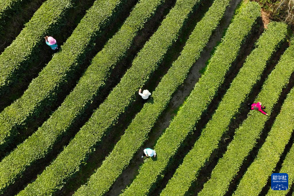 3月13日,在四川省泸州市纳溪区大渡口镇凤凰湖村拂羽茶园,当地村民采摘春茶(无人机照片)。