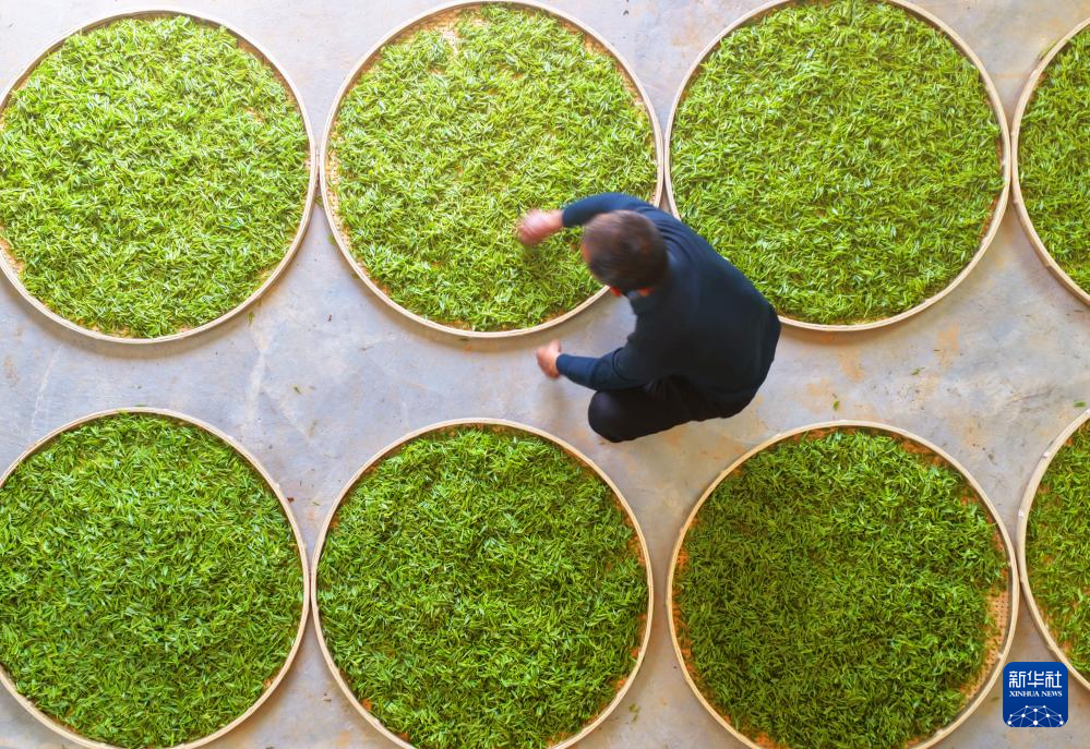 3月13日,在湖南省衡阳市衡南县宝盖镇,宝盖幸福有机茶场的工作人员在摊晒春茶(无人机照片)。