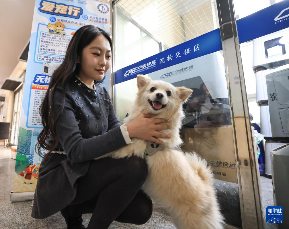 4月19日,旅客在中铁快运哈尔滨西站营业部与即将进入“智能座舱”运输箱内的宠物狗合影。