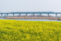 春日,在安徽省合肥市肥东县十八联圩生态湿地,油菜花竞相绽放,铺展成金色花海。高铁列车穿行其间,勾勒出一幅生动多彩的江淮大地春日图景。
